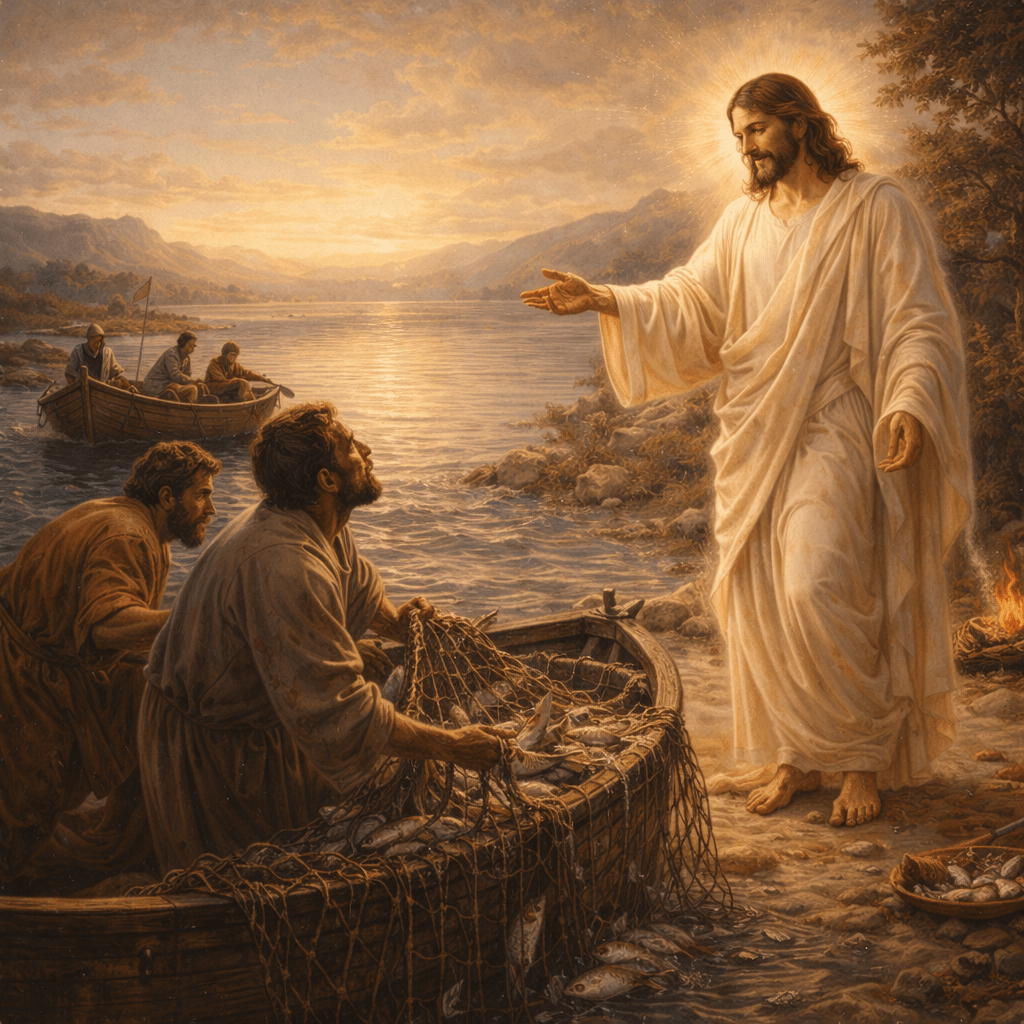 Au lever du jour, Jésus se tient sur le rivage, mais ils ne le reconnaissent pas. Il entre dans leur situation avec une question simple : « Auriez-vous quelque chose à manger ? » Puis il leur dit : « Jetez le filet à droite de la barque. » Ils obéissent, et le filet se remplit à tel point qu’ils ne peuvent plus le tirer. Alors le disciple que Jésus aimait reconnaît : « C’est le Seigneur ! »