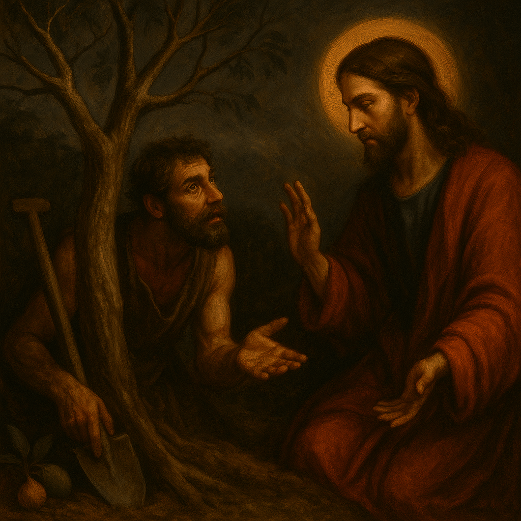 Jésus ajoute alors une parabole : celle du figuier qui ne donne pas de fruit. Le maître veut le couper, mais le vigneron intercède :