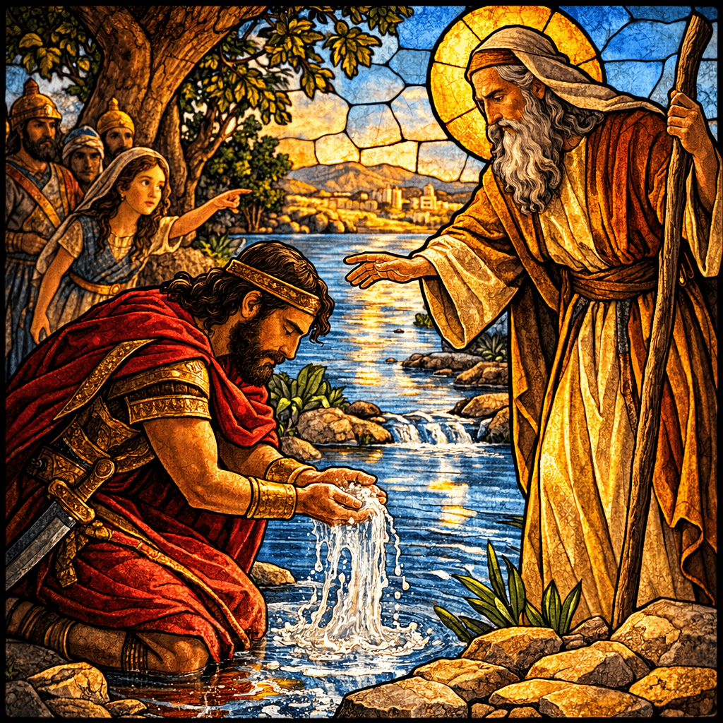 C’est une jeune esclave israélite, une personne humble et sans importance aux yeux du monde, qui lui indique le chemin de la guérison. Elle lui parle du prophète Élisée. Naaman accepte alors de suivre cette parole inattendue. Arrivé chez le prophète, il reçoit une instruction très simple : se plonger sept fois dans le Jourdain. Au début, Naaman hésite et se scandalise d’une solution si humble. Pourtant, il finit par obéir. Et c’est précisément dans cette humble obéissance que la guérison se produit : sa chair devient « semblable à celle d’un petit enfant » (2 R 5,14). La guérison vient de la confiance et de l’humilité.
