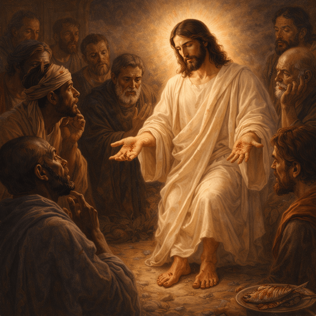 Alors Jésus fait un geste décisif : « Voyez mes mains et mes pieds : c’est bien moi ! » Il montre les marques de la Passion. Il invite à toucher, à regarder. Il va même jusqu’à manger devant eux. Le Ressuscité n’est pas une idée, ni une apparition vague : il est vivant, dans un corps réel, marqué par l’amour livré.